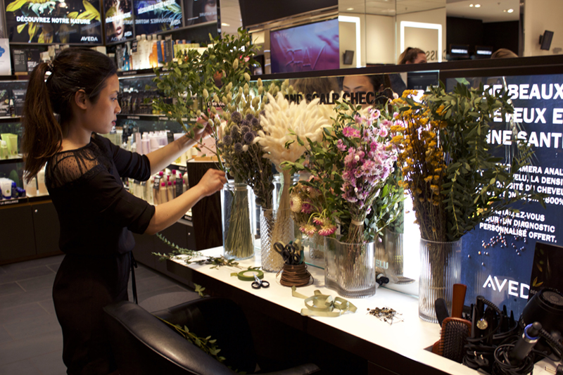 une sélection de fleurs fraîches et séchées a été mise en scène dans un flagship parisien
